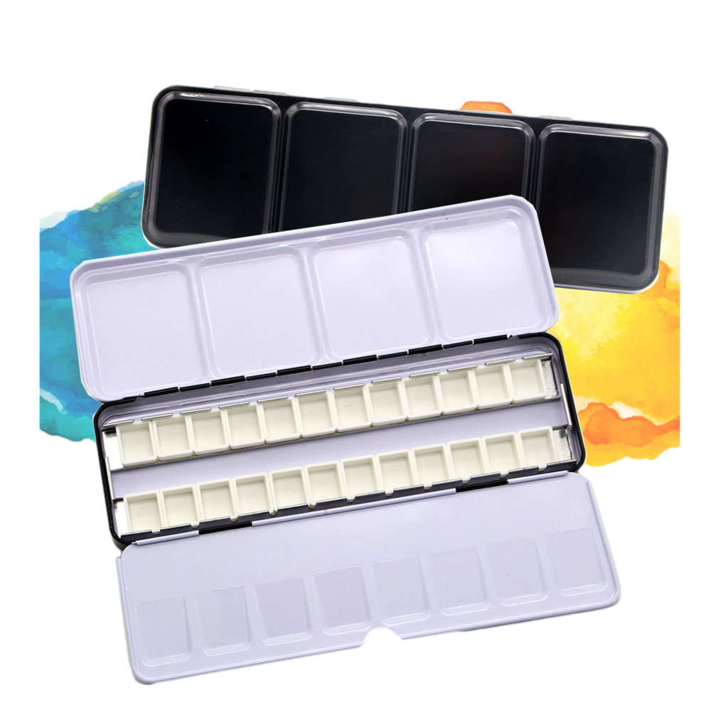 Die Metallboxen für halbe Aquarellnäpfchen gibt es in verschiedenen Größen, je nachdem wie viele Farben Du transportieren möchtest. Es gibt Modelle mit Platz für 12 oder 24 Näpfchen, die perfekt für unterwegs, im Freien oder auch für die Aufbewahrung zu Hause geeignet sind.