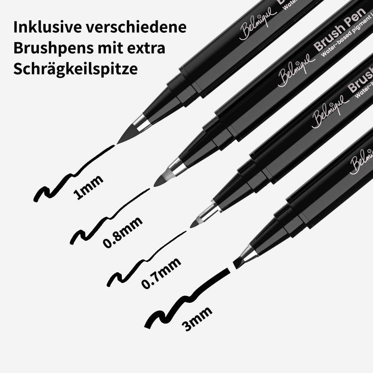 Here you will find waterproof brush pens with different sized tips: 1MM, 0.8MM and 0.7MM as well as a 3MM slanted tip.