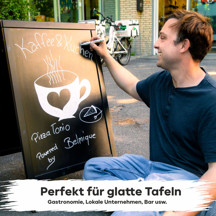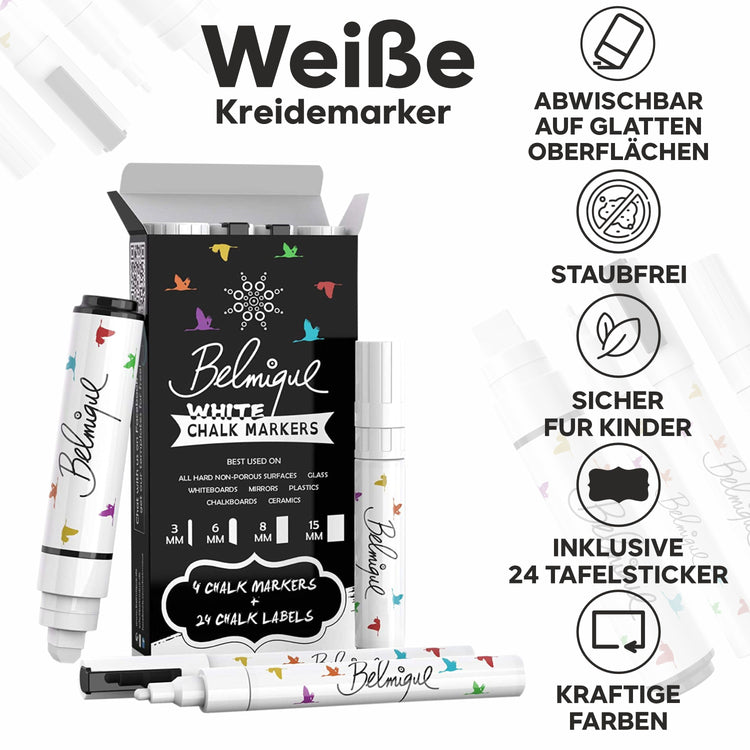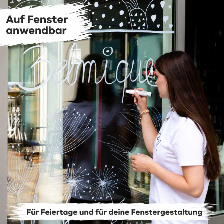 NUMEROUS SURFACES - Brilliant, opaque white chalk paints on a variety of smooth surfaces! Whether window, whiteboard, blackboard or glass - the Belmique window crayons can be used as marker pens, glass markers, chalk paint & window pens and express strong colors!