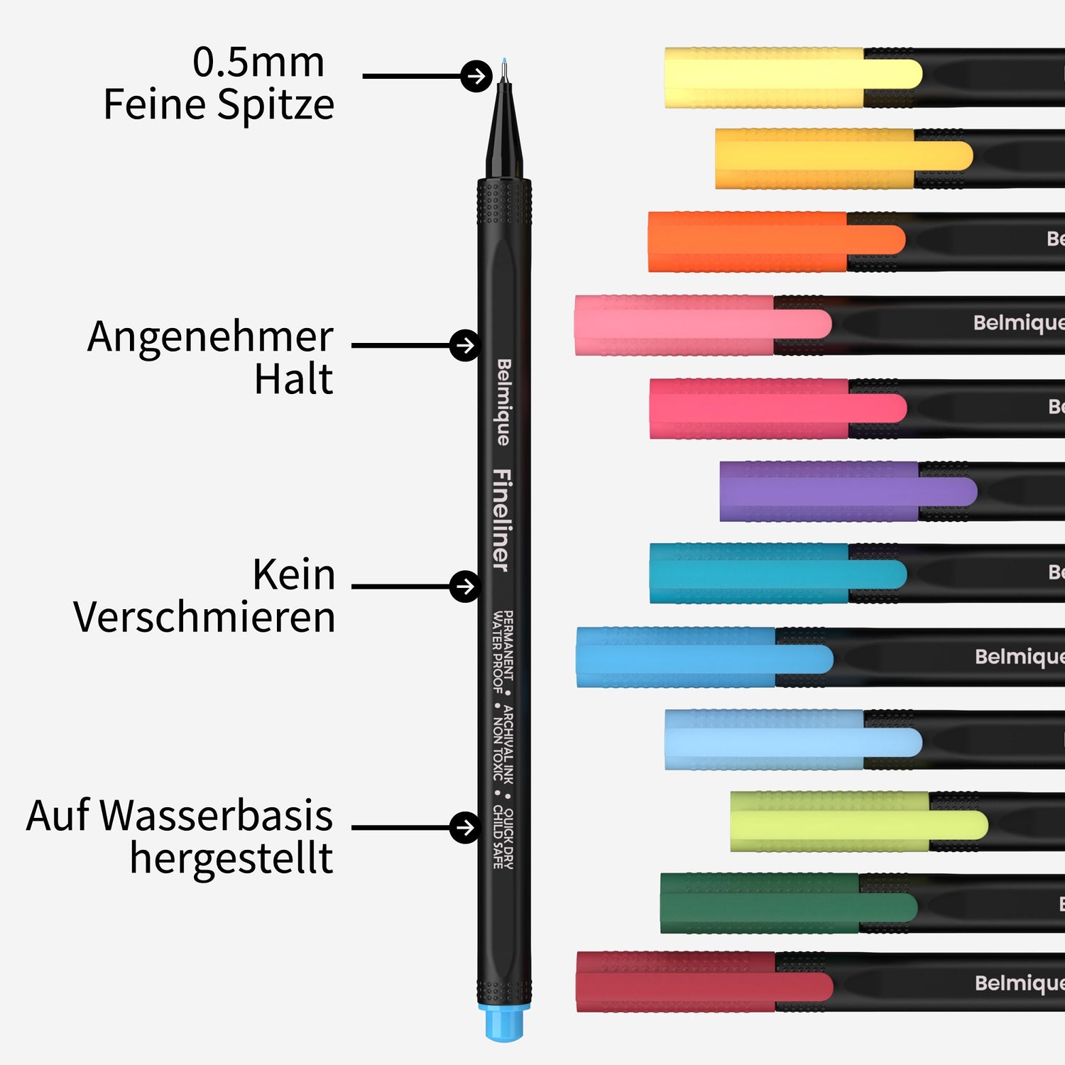 This fineliner and brush pen set includes 12 fineliners, 3 brush pens and a calligraphy pen to give you a variety of writing options for all your creative needs. The colors range from dark and light tones to soft pastel shades. Each individual pen is particularly colour-intensive, so that even the smallest details come into their own.