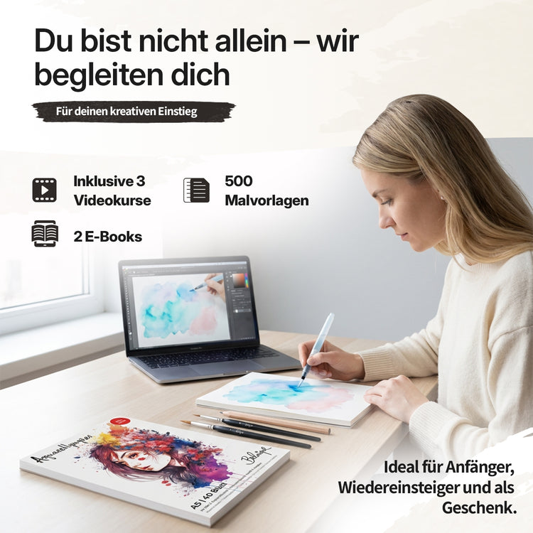 Pinsel, Fine-Liner und Bleistift inklusive. Alles was du zum Starten brauchst.
