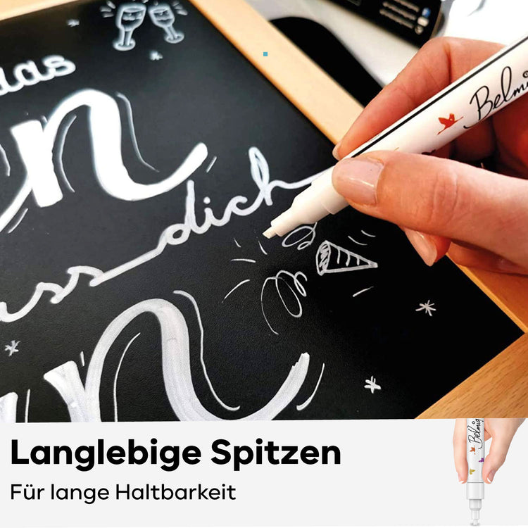 CHALK PENS FOR WINDOWS AND MORE - Brilliant white colors on a variety of smooth surfaces! Whether window, whiteboard, blackboard or glass - our markers can be used as whiteboard markers, glass markers, chalk paint & window pens and express bold colors!